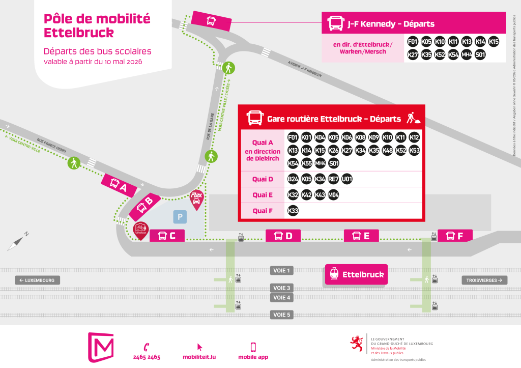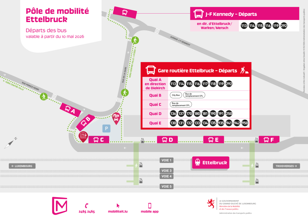 Dès le 10 mai 2026, les lignes: 113, 114, 115, 116, 117, 118, 119, 130, 131, 132, 133, 134, 135, 136, 137, 170, 180, 181, 190, 191, 250, 292, 935, 941, 942, 950, B24, K01, K04, K05, K06, K08, K09, K10, K11, K12, K13, K14, K15, K26, K27, K32, K33, K34, K35, K42, K43, K48, K52, K53, M04, MH4 et RE7 seront entièrement réorganisées suite à la prochaine phase du chantier du pôle de mobilité d’Ettelbruck.